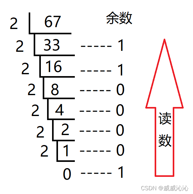 将67除以2得商33,余数1。将商(33)作为第二次的被除数一次类推,直到商为0.