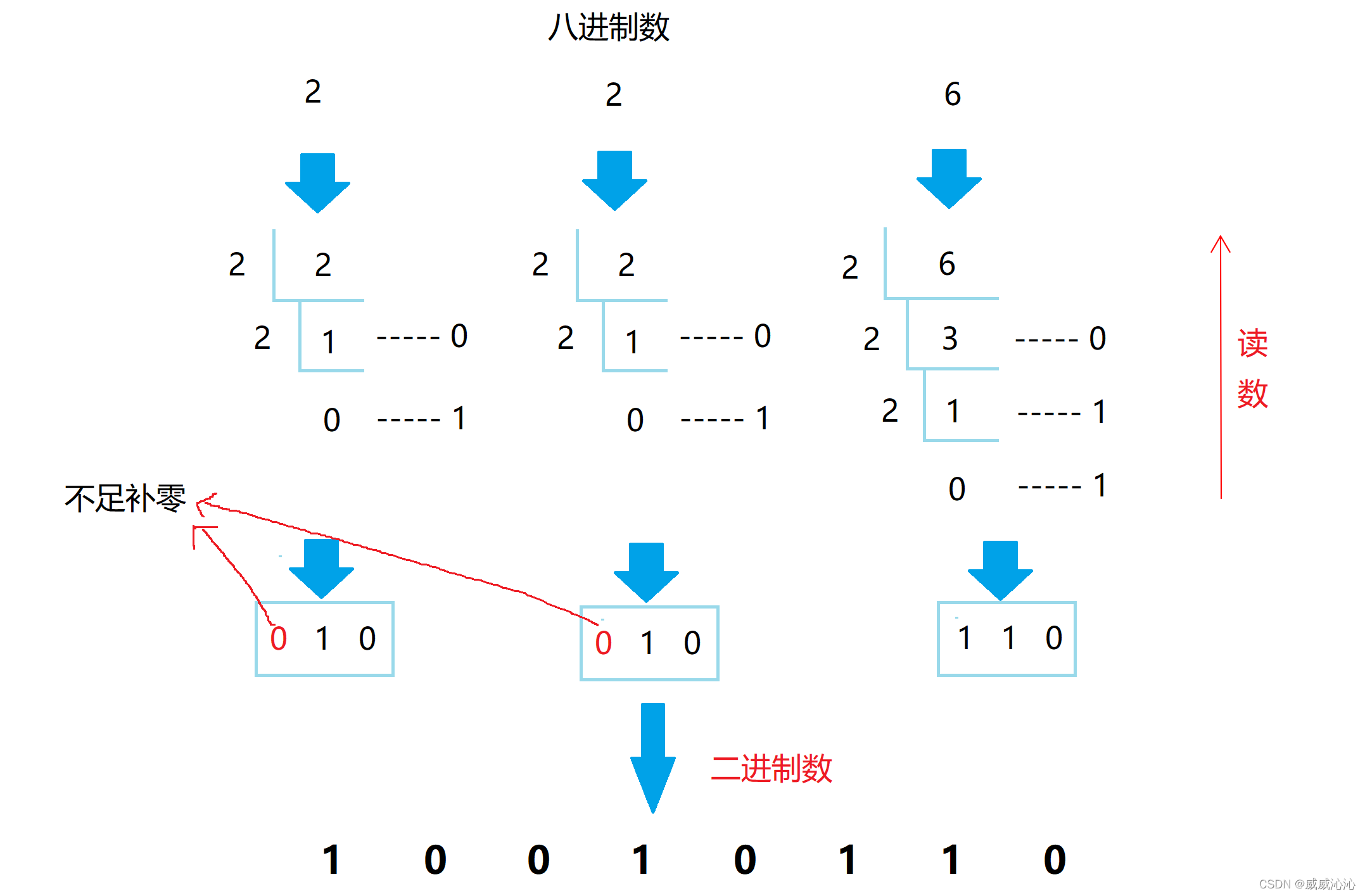 方法:八进制数通过除2取余法,得到二进制数,对每个八进制为3个二进制,不足时在最左边补零。