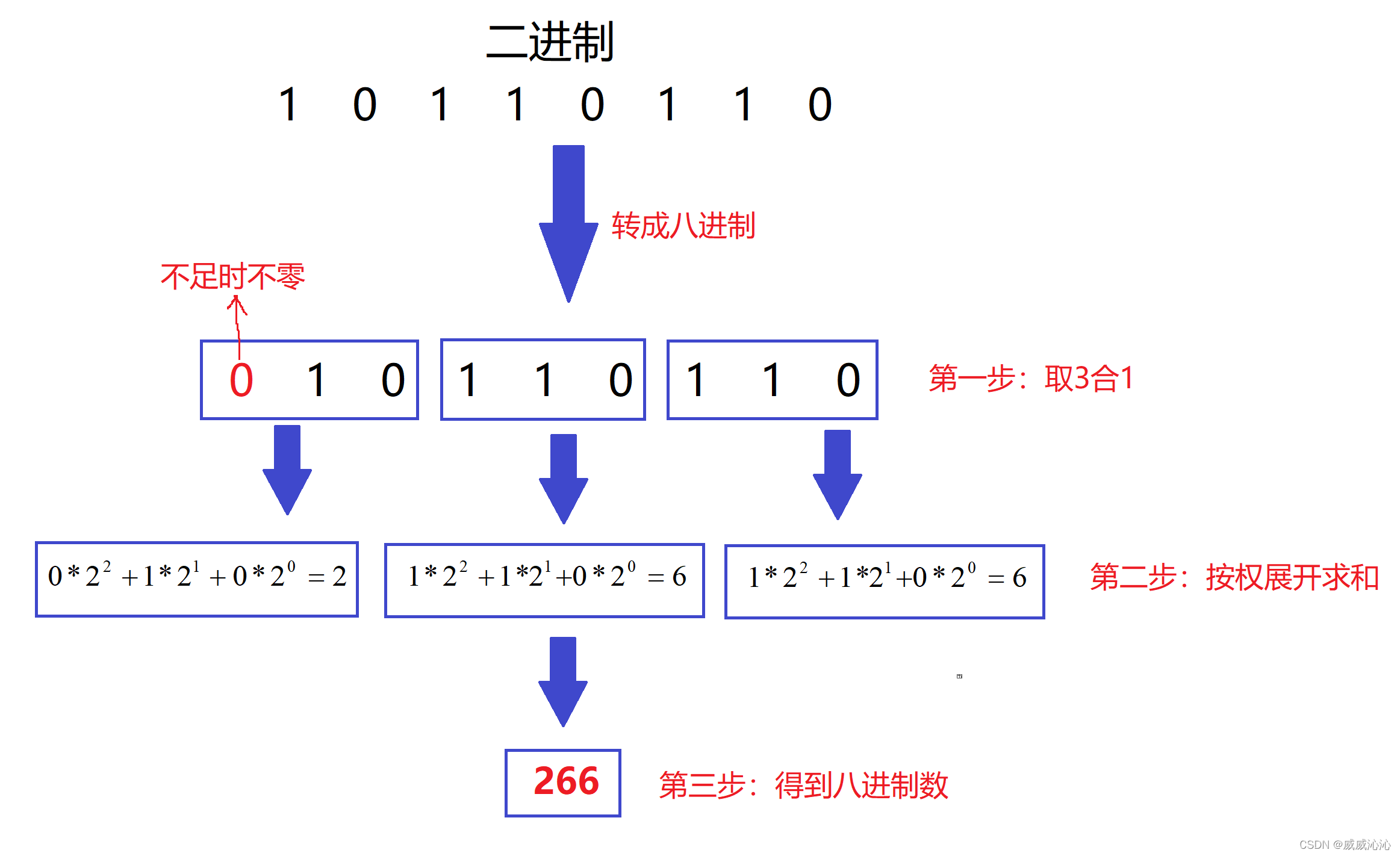 方法:3位二进制数按权展开相加得到1位八进制数。(注意事项,3位二进制转成八进制是从右到左开始转换,不足时补0)。